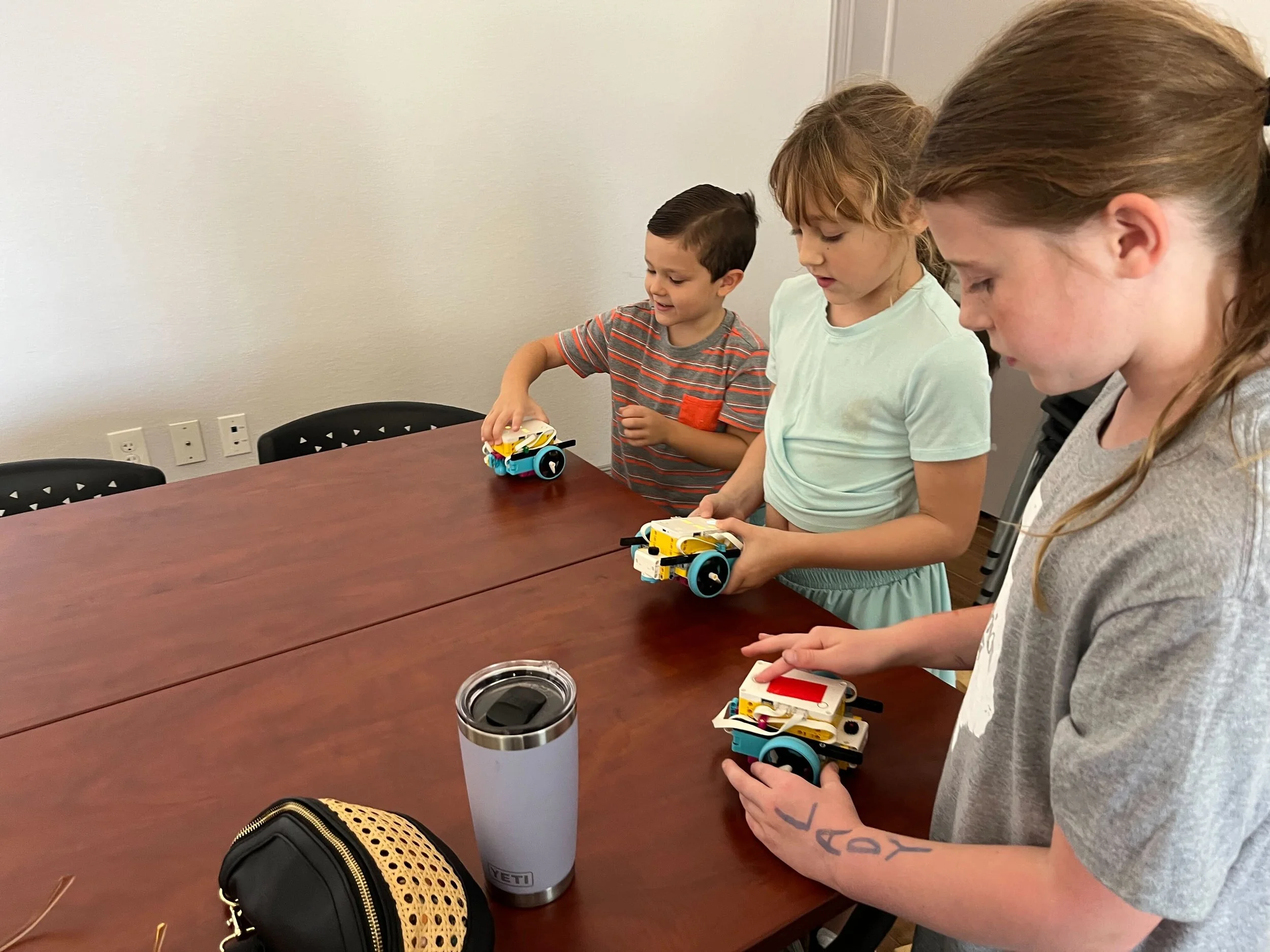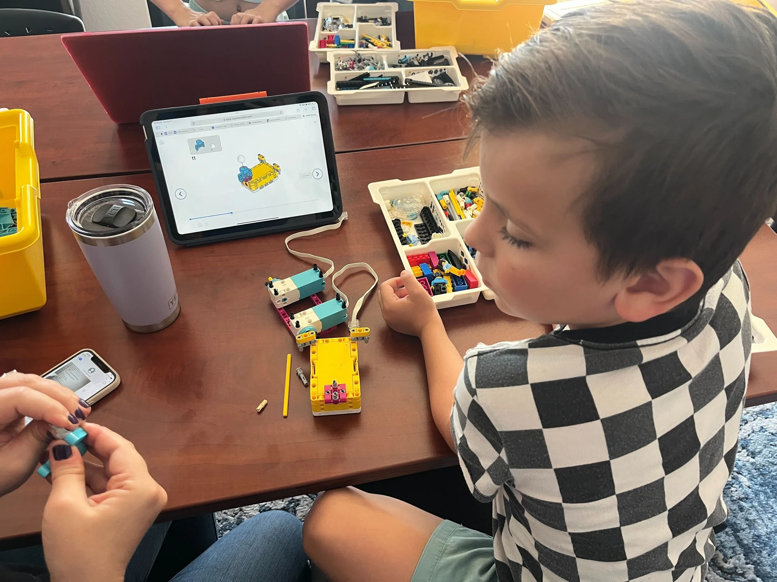 Students use LEGO Spike Kits to build a robot and use Scratch to code a program before racing the bots across tables and floors.